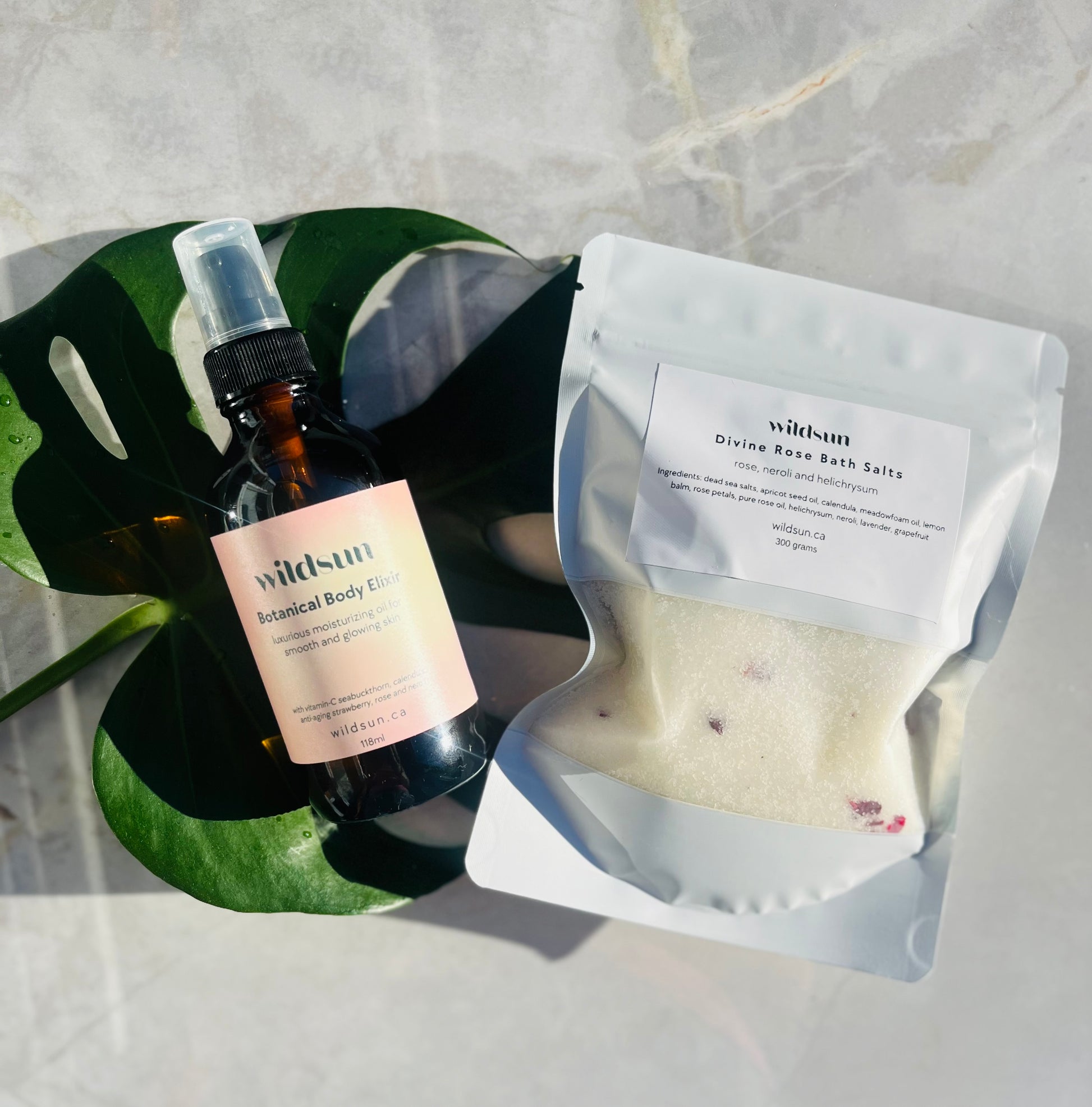 The Divine Bath Salts are formulated in a concentrated version of herbals and essentials so that you only need to add one or two tablespoons of the salts to your bath. This allows this precious pouch of herbals, antioxidant rich oils, salts and essentials to go further. Add in your own extra Epsom or Dead Sea Salts for a saltier more detoxifying, skin softening and repairing experience.