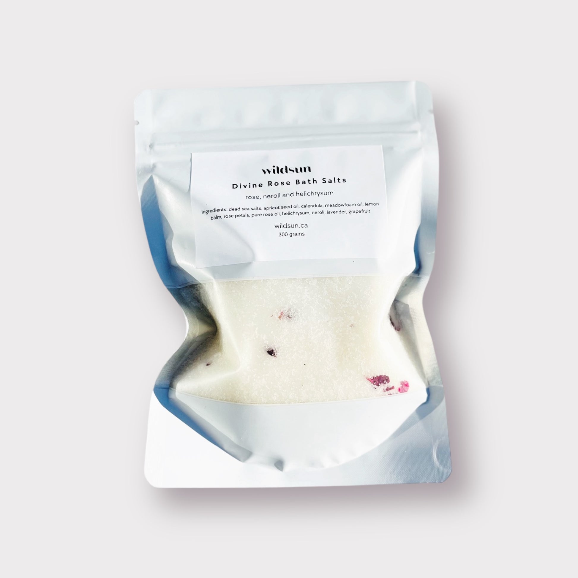Divine Rose Bath Salts: sensual and floral - neroli, rose, helichrysum, lavender with rose petals