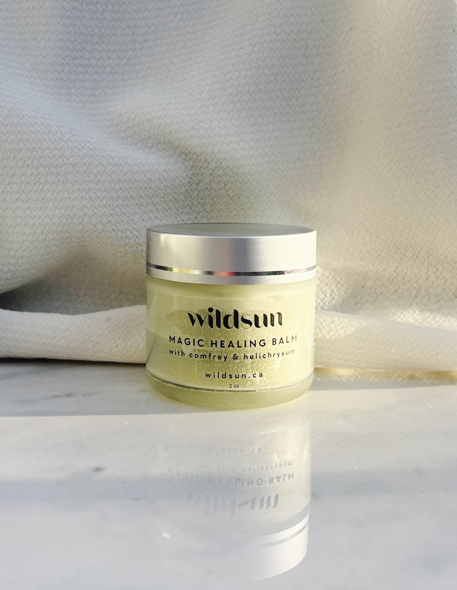 Magic Healing Balm is formulated with the healing powers of comfrey and helichrysum and may helps soothe the discomfort of broken bones, injuries of tendons or ligaments, painful muscles and in its versality is a wonderful spot treatment to remove age spots and wrinkles/crepey skin on your face and body!